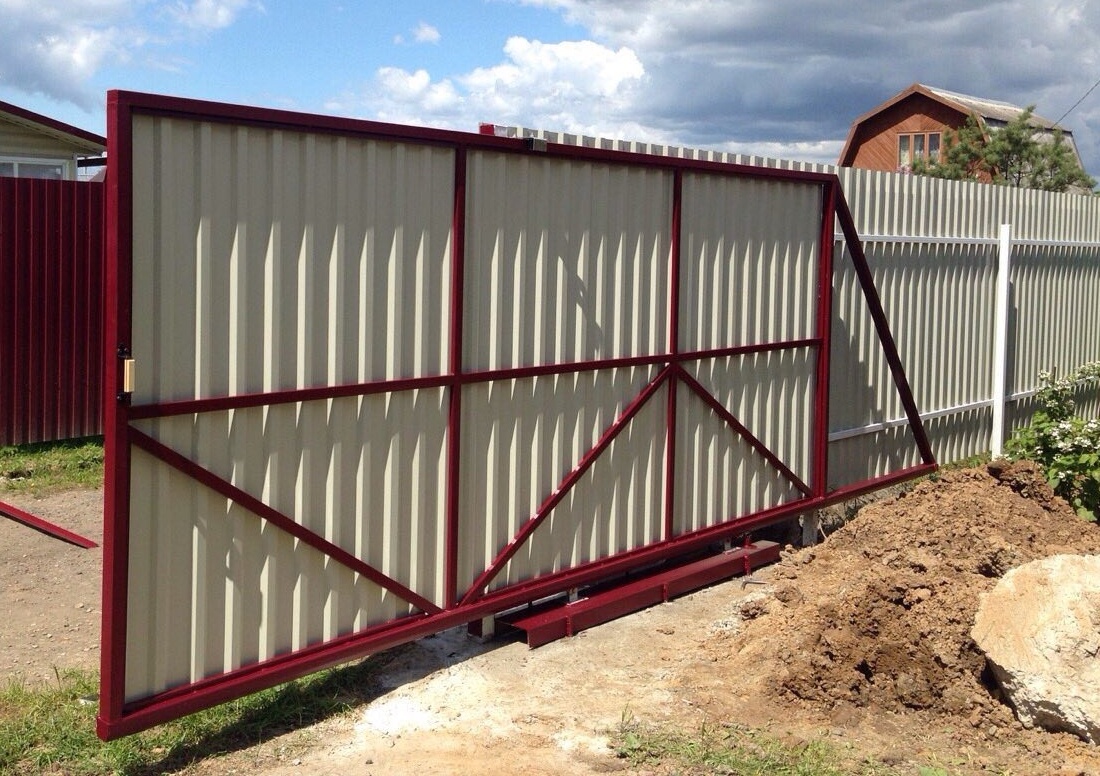 - Панелі. У відкатних воротах вони присутні в кількості одної або двох штук. Фіксація панелей здійснюється до профілів або горизонтальних рам. Для виготовлення цих елементів застосовуються метал, деревина або композити.